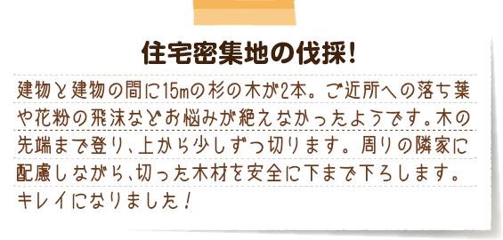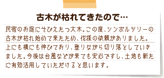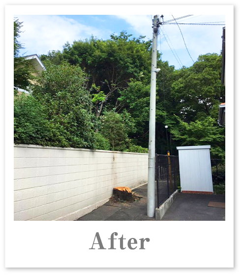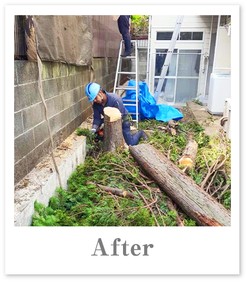 自宅の木の枝が道路にはみだし通行者に迷惑をかけていました。余計な枝を切っていただきスッキリしました。また今後伸びた時のご提案も頂き助かりました。