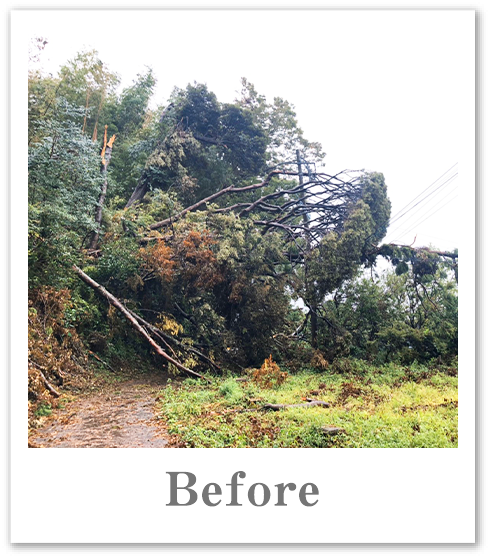 立ち木は、いつの間にか成長し、思いもよらない方向へ伸びます。枝木が折れたり、枯れ葉がトイを詰まらせたりと悪影響を及ぼすことがございます。また、倒木や枝折れによるケガや建物の損傷など被害がでることもございます。