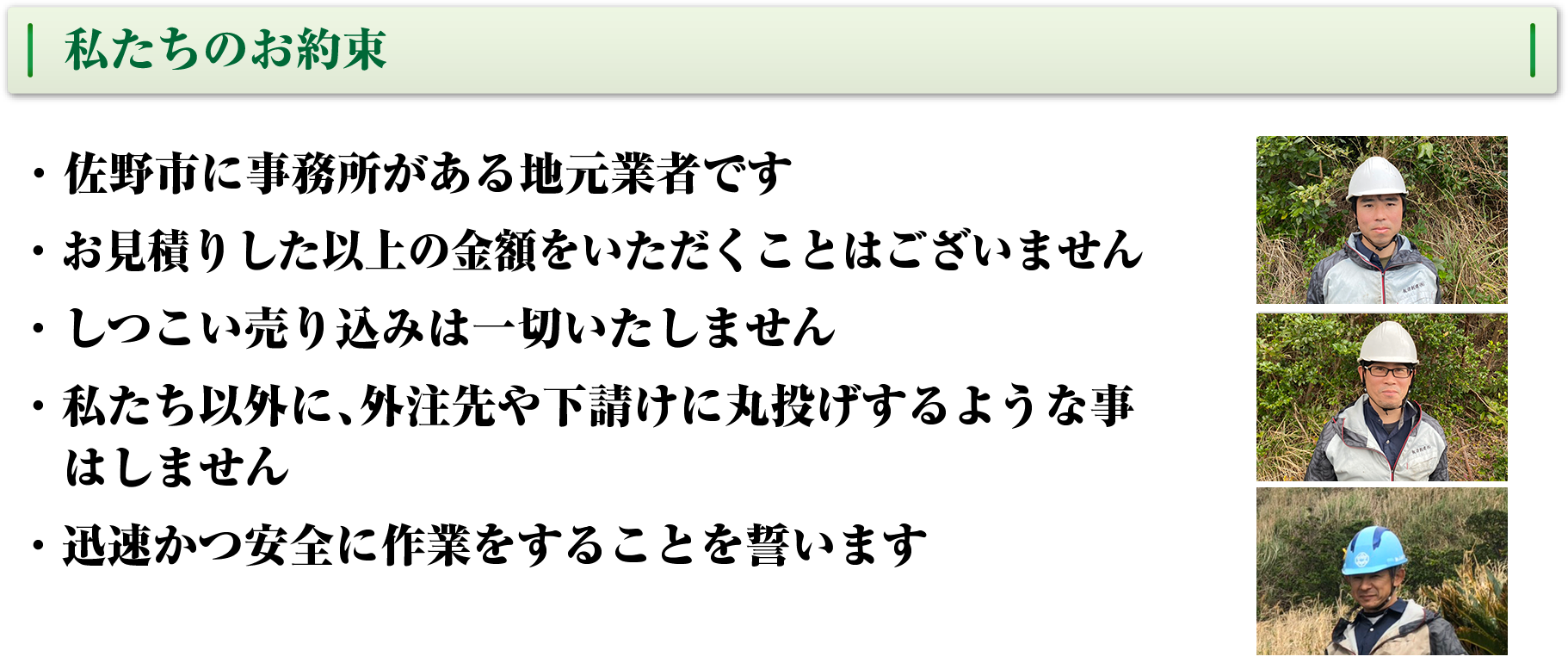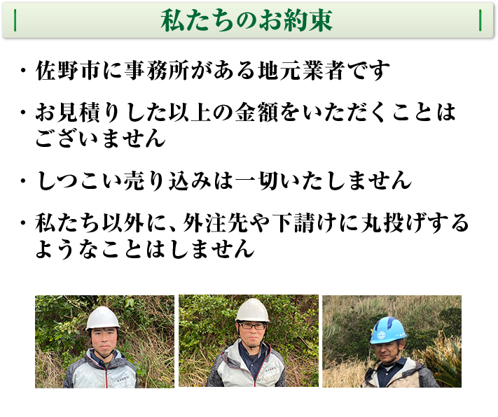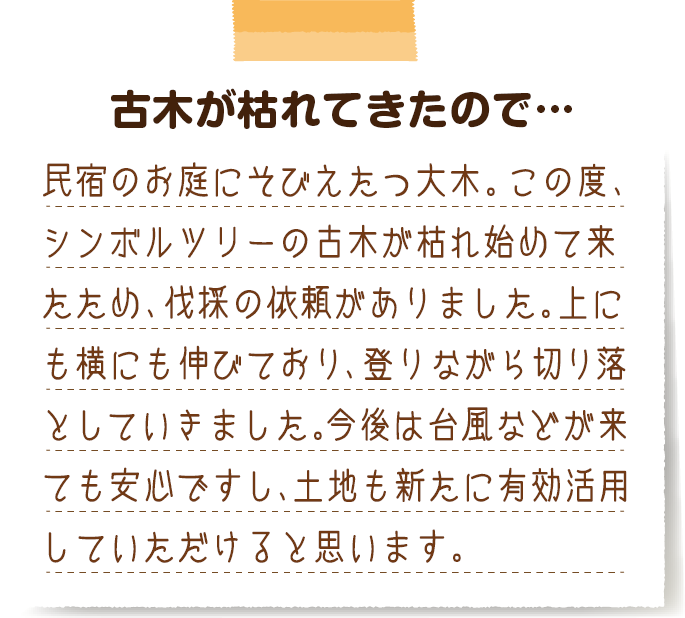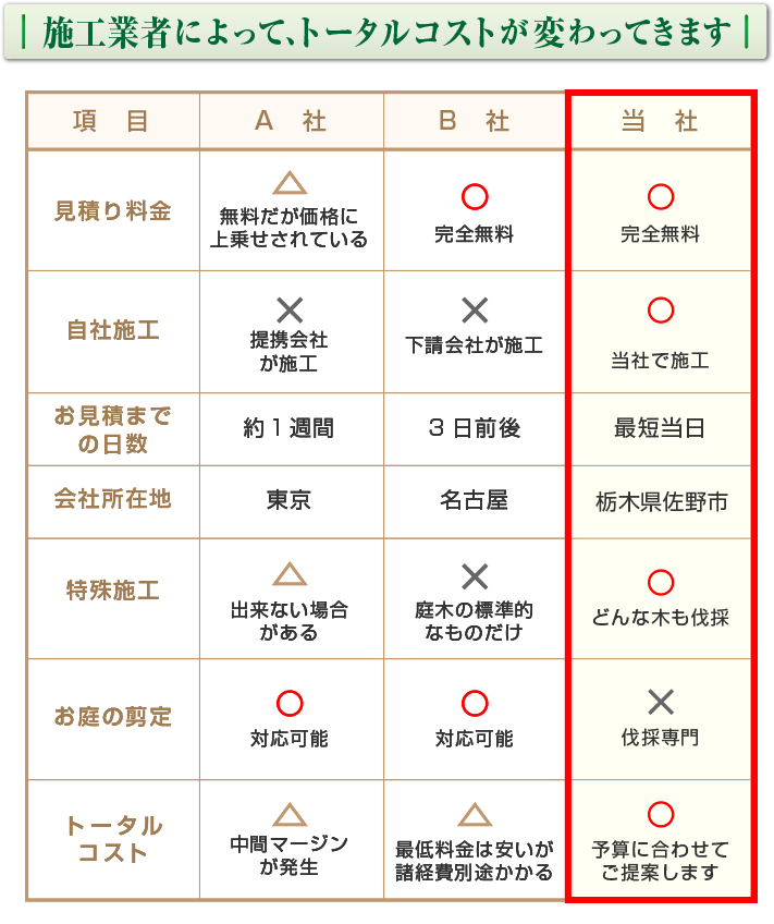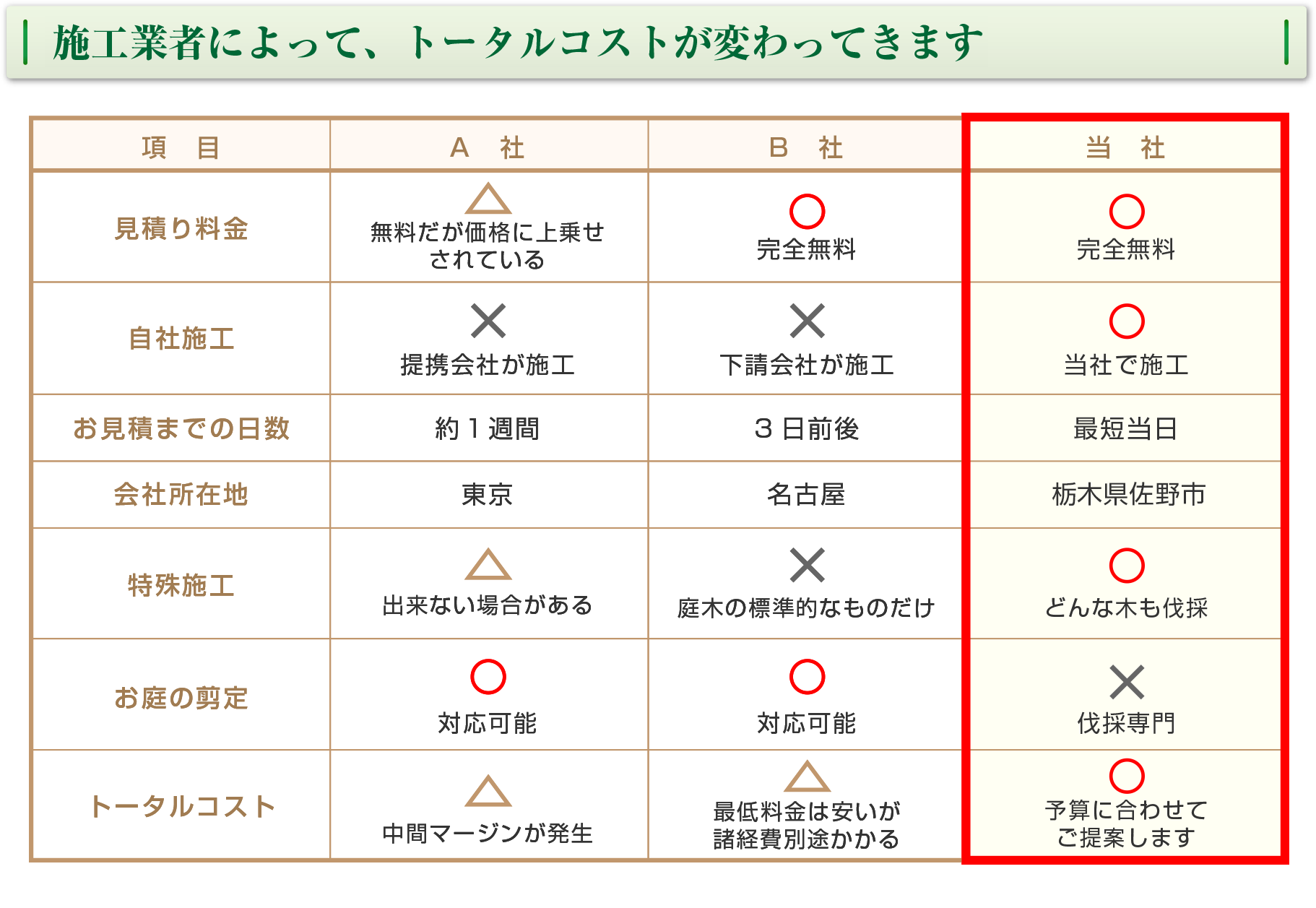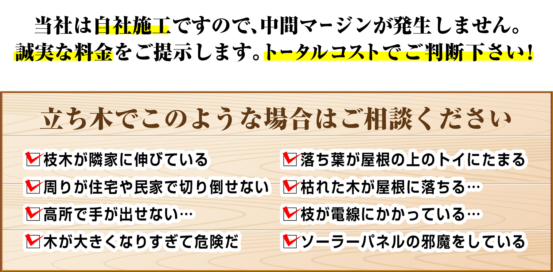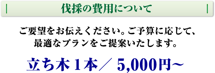 弊社では、お客様のご要望をお聞きしご提案しています。ご予算にあわせて、最低限どこを伐採すれば良いかお話し、誠実な料金をご提示させていただいています。