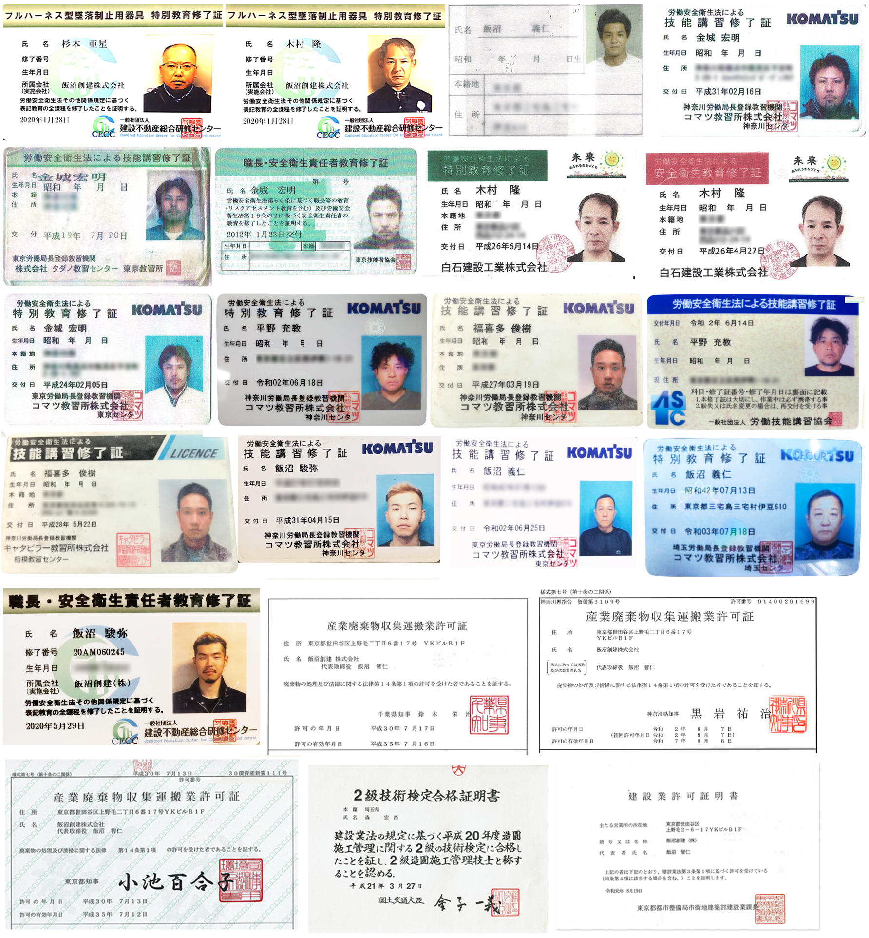 | 許可等 | 建設工事業他15業 東京都知事許可(般-27)第144500号 解体工事業 東京都知事許可(般-1) 第144500号 産業廃棄物収集運搬業許可 東京都 第13-00-201699号 産業廃棄物収集運搬業許可 千葉県 第01200201699 号 産業廃棄物収集運搬業許可 神奈川県 許可番号01400201699 小型移動式クレーン技能特別講習修了 高所作業車運転技能講習修了 玉掛け技能講習修了 車両系建設機械(整地等)運転技能講習修了 車両系建設機械(解体用)運転技能講習修了 職長・安全衛生責任者教育修了 ローラー運転特別教育修了 伐木チェーンソー特別教育修了 令和2年8月改正 伐木等の業務(チェーンソー)特別教育修了 刈払機取扱作業者安全衛生教育修了 伐木等の業務(則第36条第8号)特別教育修了 フルハーネス型墜落制止用器具特別教育修了 1級土木施工管理技士 2級造園施工管理技士 労働安全衛生法による技能講習修了 足場の組立て等作業主任者技能講習修了 労働安全衛生法による特別教育修了 |
